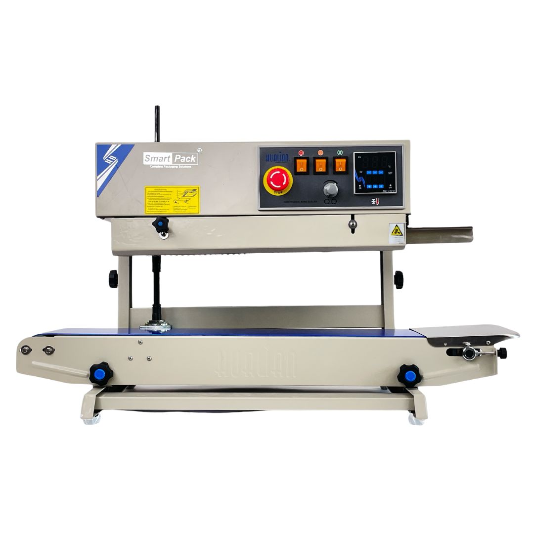 A vertical band sealing machine is designed to seal bags or pouches in an upright position, making it ideal for packaging liquids, powders, and granules. It uses heat and pressure to create a strong, airtight, and tamper-proof seal, ensuring product safety and freshness. The machine features an adjustable conveyor system, temperature control, and sealing speed, allowing it to work with various packaging materials. Widely used in food, pharmaceuticals, and industrial packaging, it provides efficient, high-speed sealing for bulk production.